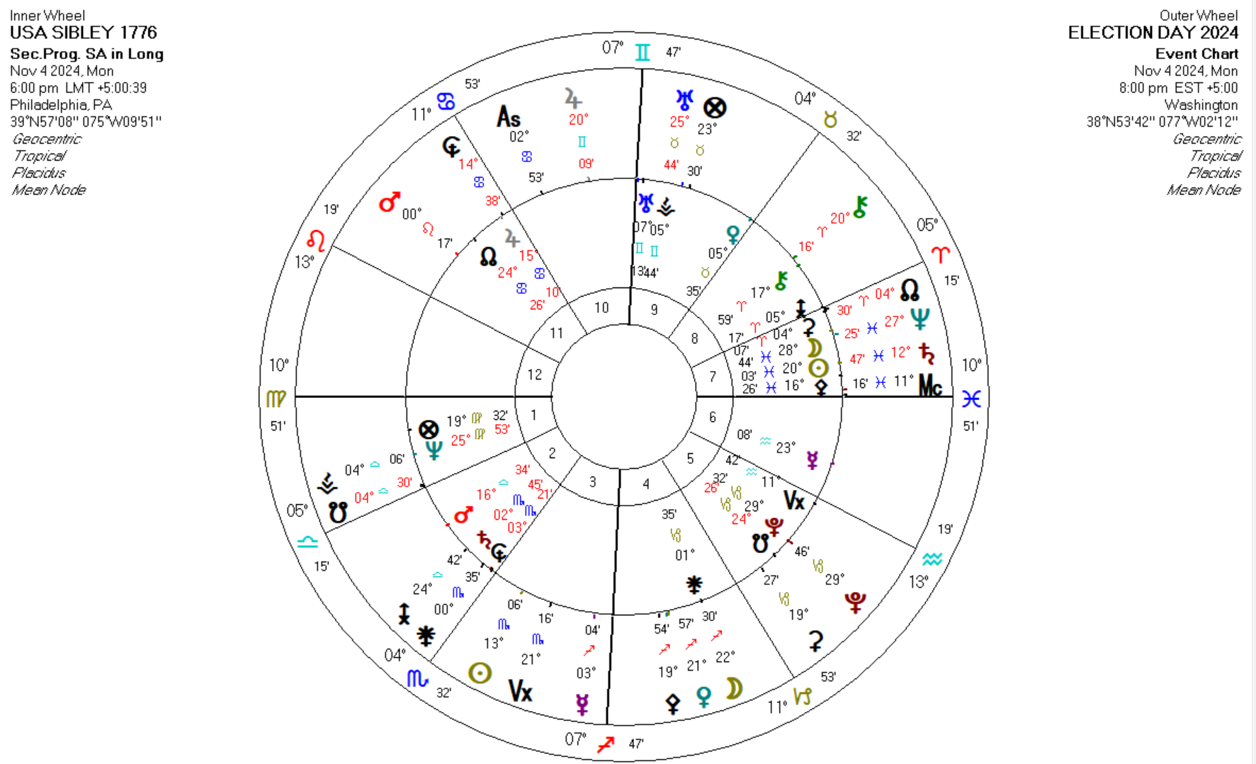Three astrological points show up as very strong possibilities for a woman pres. Pallas Athena, Moon and Venus. We are looking above at the progressed birth chart of the USA from 1776 and the chart at sunset the night before Election Day, 2024. (~~~~~~ The reason...